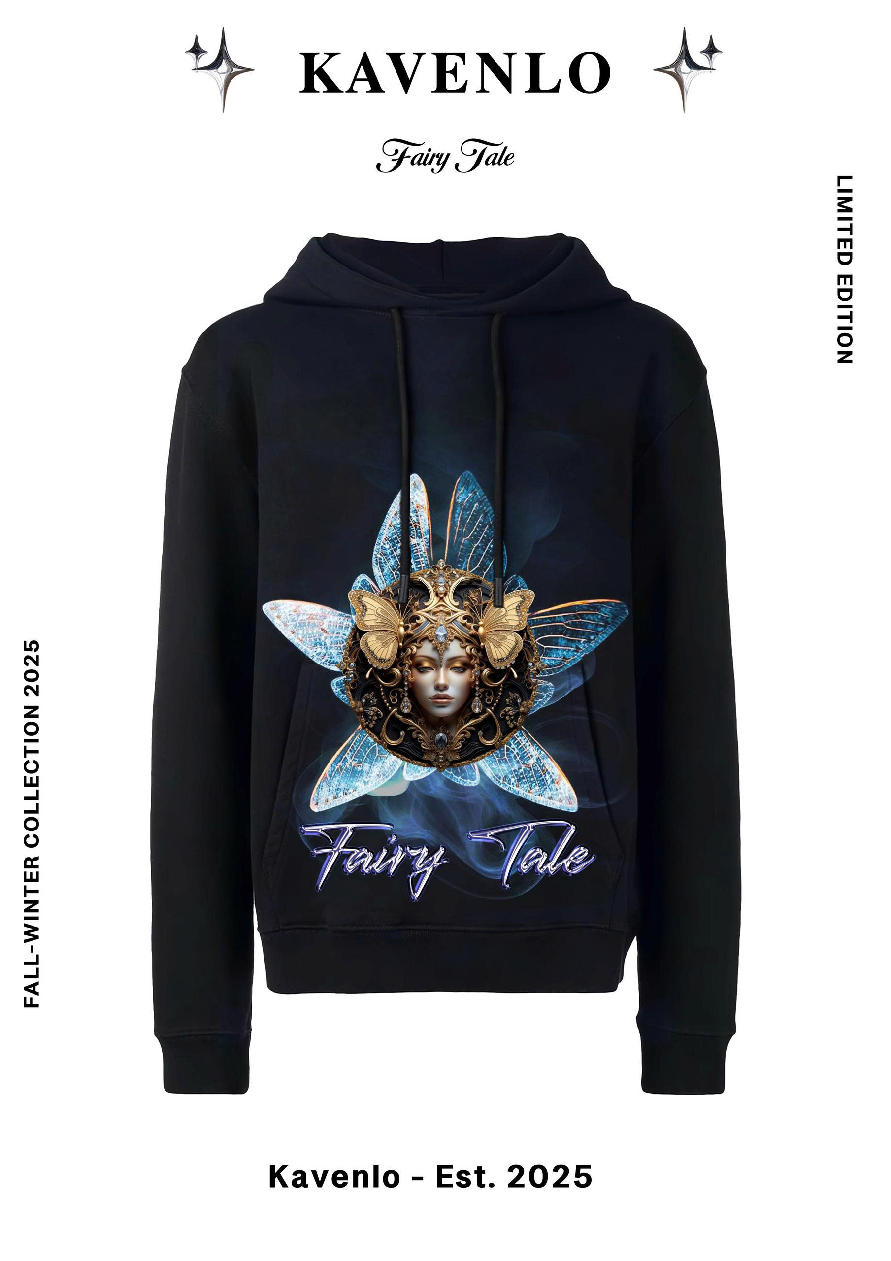Lấy cảm hứng từ nàng tiên trong truyền thuyết, thiết kế tái hiện vẻ kỳ ảo, thanh tao và sang trọng của nghệ thuật cổ điển hòa cùng tinh thần streetwear đương đại. Gam đen chủ đạo kết hợp ánh kim vàng và sắc xanh lam huyền ảo tạo nên vibe ma mị, quyến rũ, mang đậm dấu ấn KAVENLO.