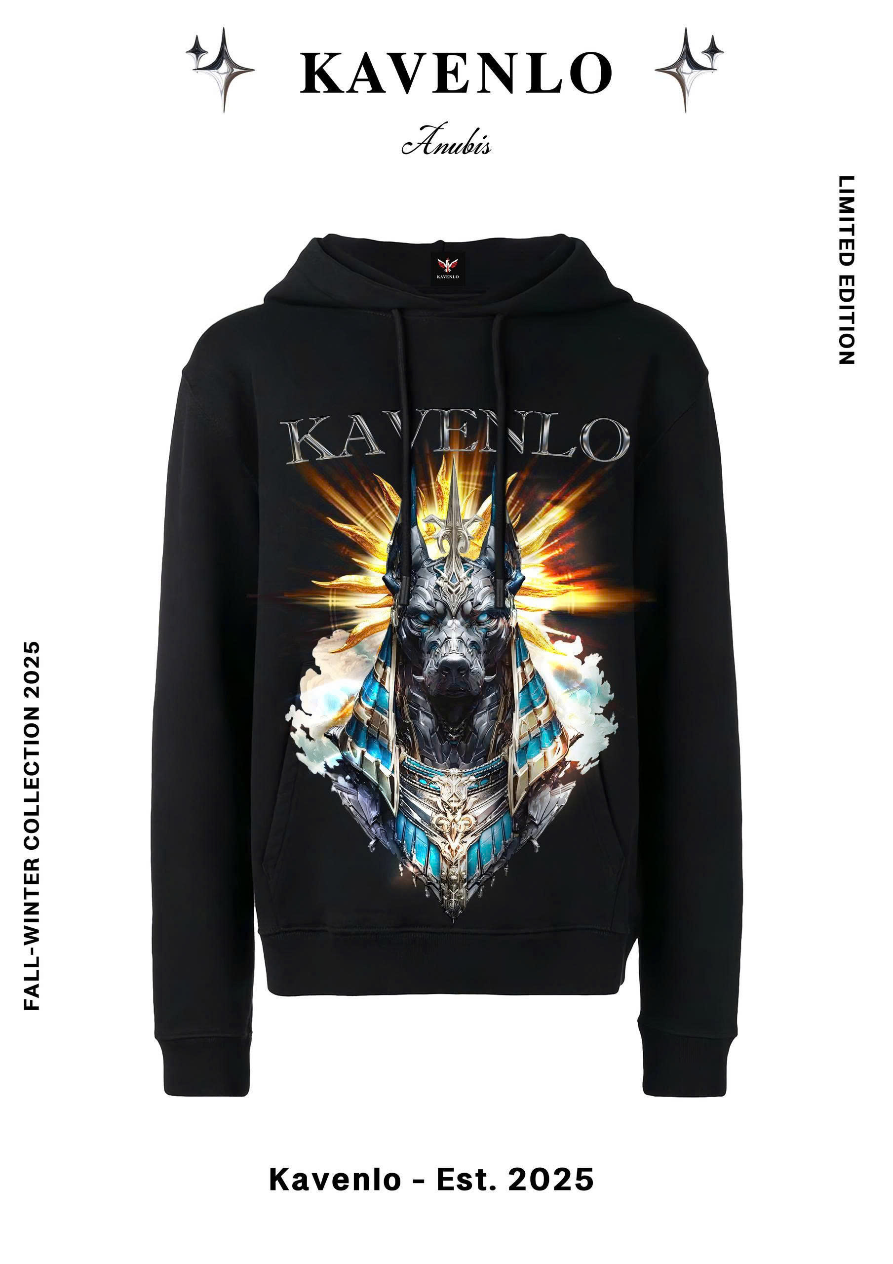 “Anubis” lấy cảm hứng từ thần Ai Cập cổ đại – vị thần cai quản thế giới linh hồn, biểu tượng của quyền năng, sự tái sinh và bảo hộ. Thiết kế kết hợp ánh sáng hoàng kim với sắc lam kim loại, thể hiện hình ảnh Anubis mang phong thái của một chiến thần hiện đại – mạnh mẽ, thần bí và đầy uy lực trong ngôn ngữ luxury streetwear của KAVENLO.
