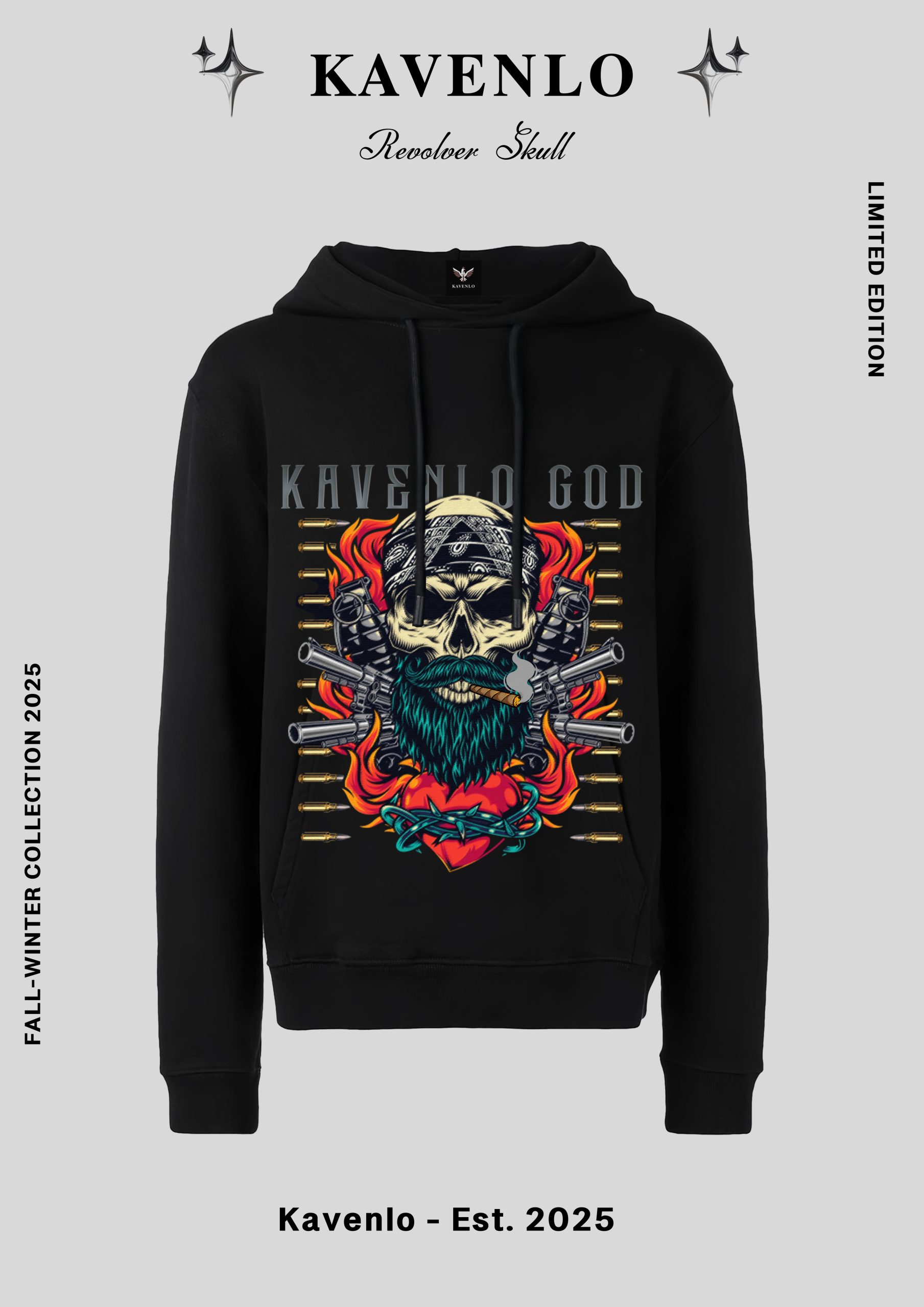 “Revolver Skull” là biểu tượng của tinh thần tự do và bất khuất, kết hợp hình ảnh đầu lâu đội khăn bandana, điếu cigar và cặp súng revolver – gợi cảm hứng từ văn hóa biker Mỹ và phong cách rock streetwear. Tông màu đỏ – đen – bạc kim loại mang lại vẻ ngầu, mạnh mẽ và cực kỳ thời thượng cho người mặc.