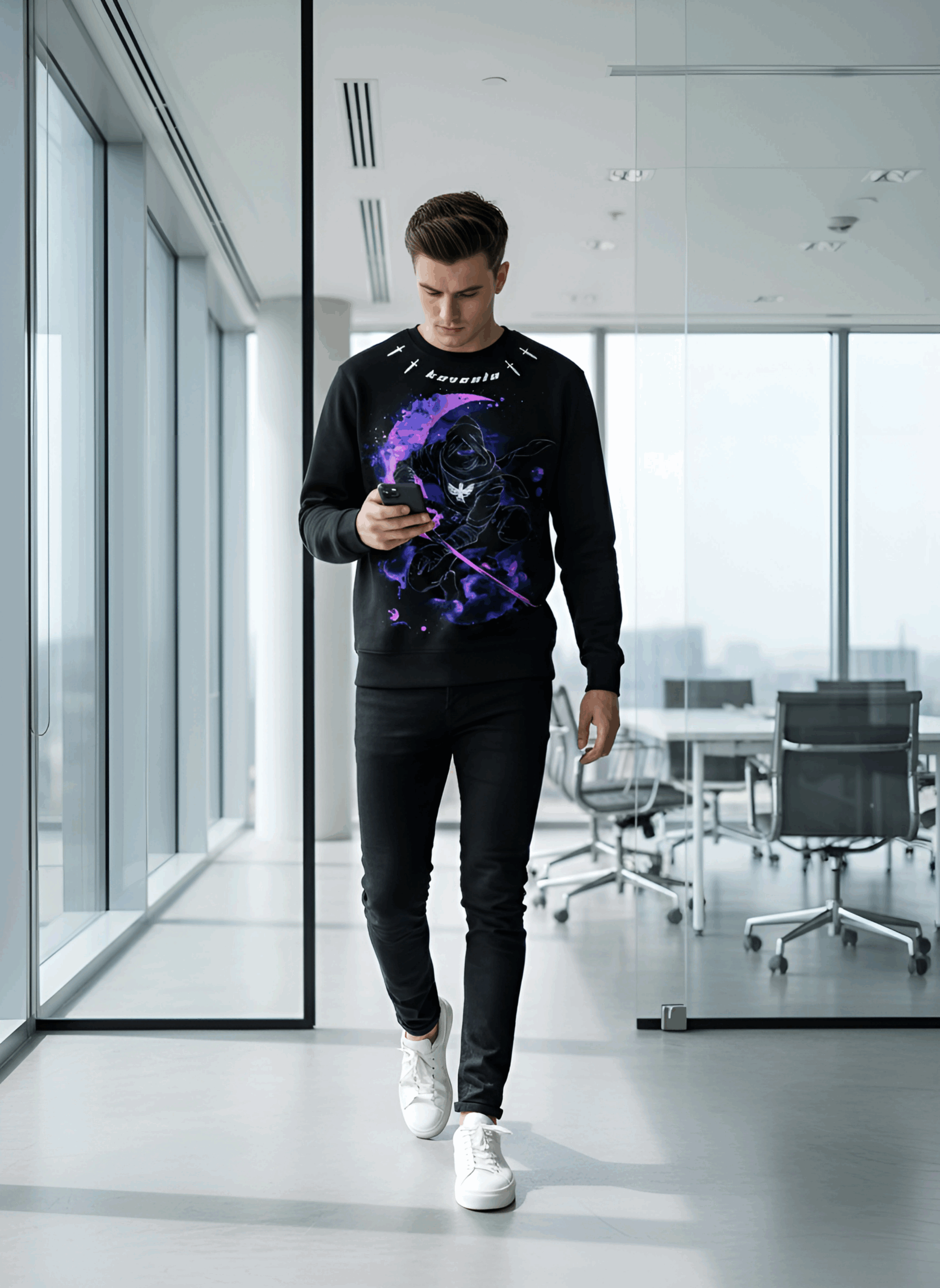 Moon Slayer lấy cảm hứng từ chiến binh của bóng đêm – người lặng lẽ đối đầu cùng ánh trăng. Thiết kế khắc họa hình tượng ninja giữa không gian vũ trụ tím – nơi ánh sáng và bóng tối giao thoa, biểu trưng cho cuộc chiến nội tâm giữa bản năng và lý trí. Gam màu tím cosmic kết hợp hiệu ứng ánh sáng neon tạo cảm giác siêu thực, lạnh lùng và cuốn hút, như một bản giao hưởng giữa tĩnh và động. Với thông điệp “Less Noise – More Style”, Moon Slayer tôn vinh phong thái của những kẻ không cần ồn ào để trở nên huyền thoại.