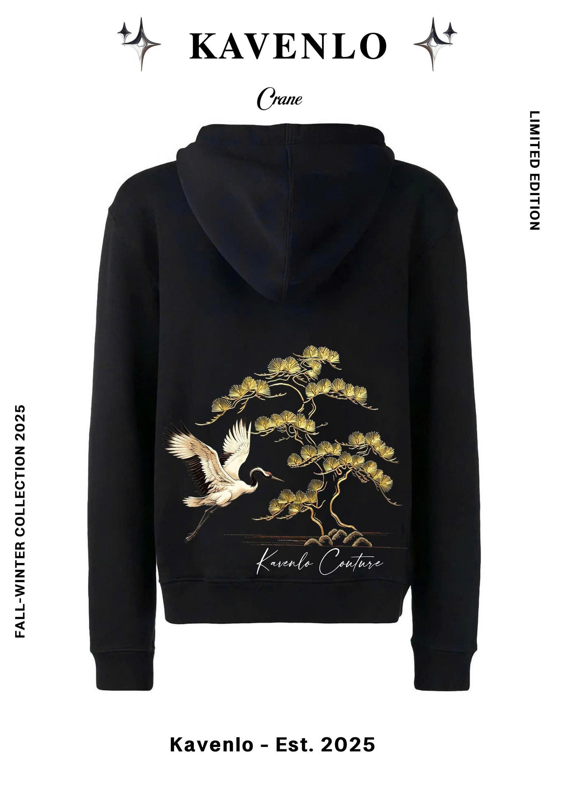 Lấy cảm hứng từ hình ảnh chim hạc và cây tùng – biểu tượng của trường thọ, may mắn và tinh thần thanh tao. Gam đen chủ đạo kết hợp chi tiết vàng ánh kim mang đến vẻ sang trọng, tinh tế, thể hiện rõ tinh thần KAVENLO Couture – đơn giản nhưng đẳng cấp.