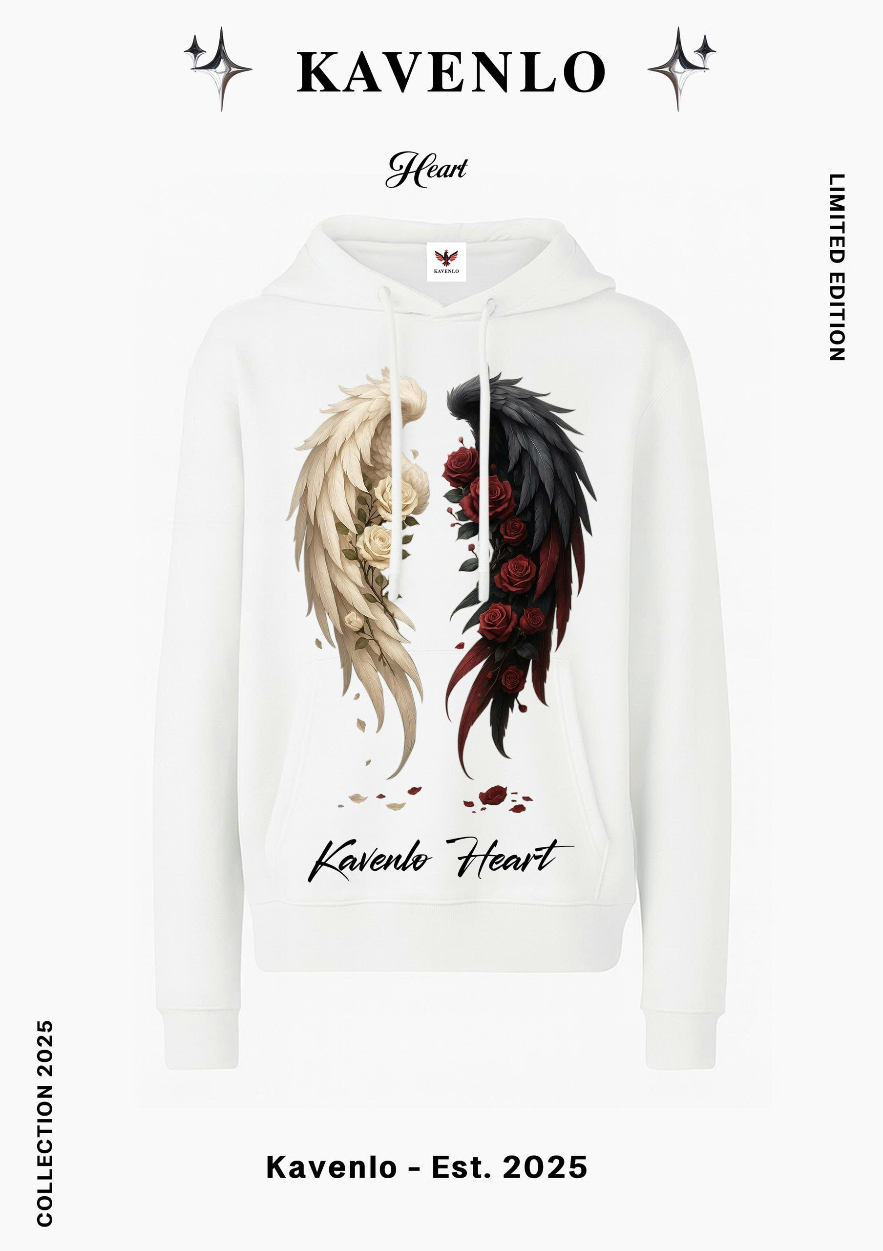 Heart là biểu tượng của hai nửa linh hồn – ánh sáng và bóng tối, thuần khiết và đam mê. Đôi cánh trắng và đen hòa quyện quanh những đóa hồng tượng trưng cho sự đối lập trong cảm xúc con người: dịu dàng và mãnh liệt, tổn thương và hồi sinh. Bố cục đối xứng cùng gam màu trầm sang tạo nên cảm giác vừa lãng mạn, vừa siêu thực, gợi nên vẻ đẹp của những tâm hồn biết yêu, biết đấu tranh, và biết giữ lại phần nhân bản giữa hỗn độn. Thiết kế truyền tải tinh thần “Less Noise – More Style” – khi cảm xúc sâu sắc nhất không cần ngôn từ, mà toát ra qua sự tĩnh lặng của trái tim.