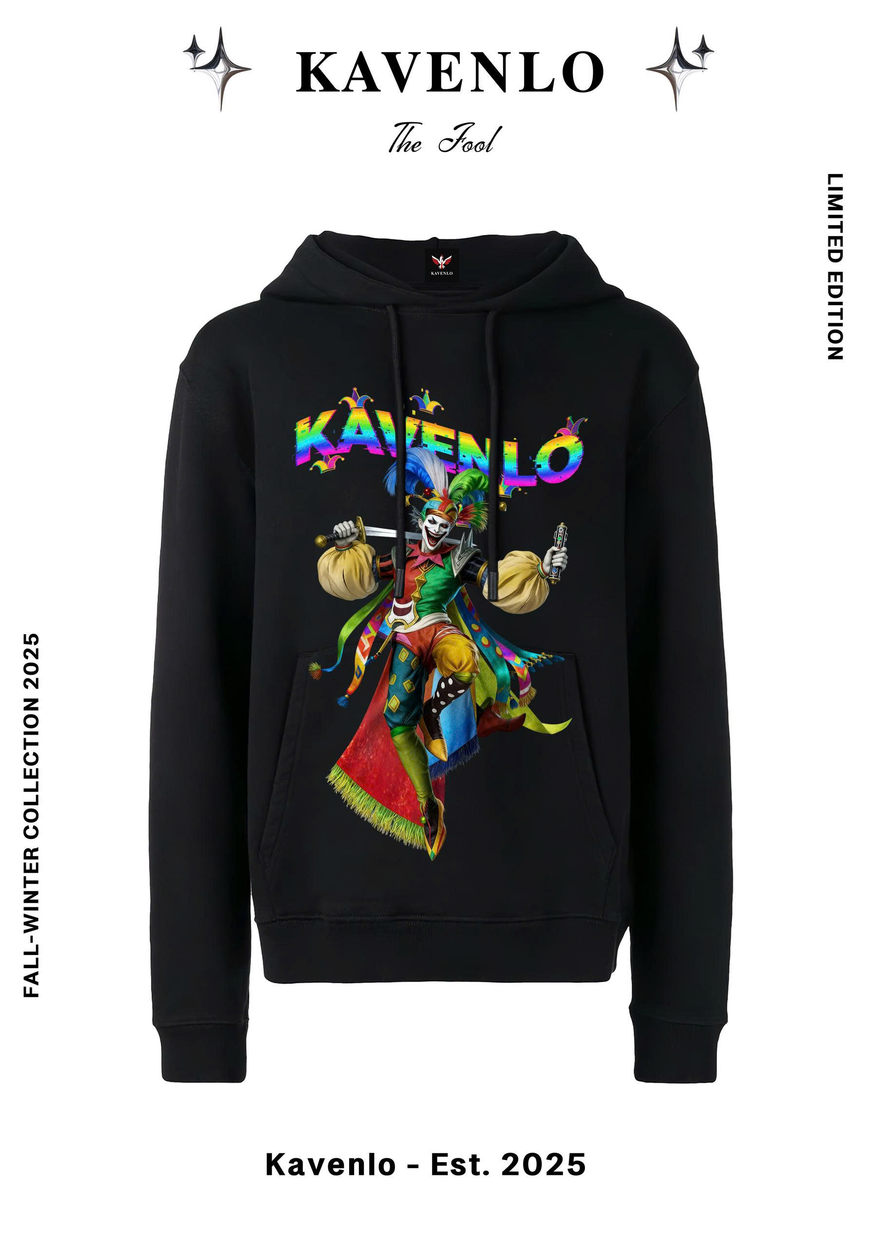 “The Fool” đại diện cho tinh thần tự do và phá vỡ giới hạn – hình ảnh chú hề đầy màu sắc nắm kiếm và bài tarot, biểu trưng cho niềm tin, sự liều lĩnh và khởi đầu mới. Thiết kế mang năng lượng rực rỡ, vui nhộn nhưng vẫn giữ nét luxury streetwear đặc trưng của KAVENLO, dành cho những tâm hồn dám sống khác biệt.