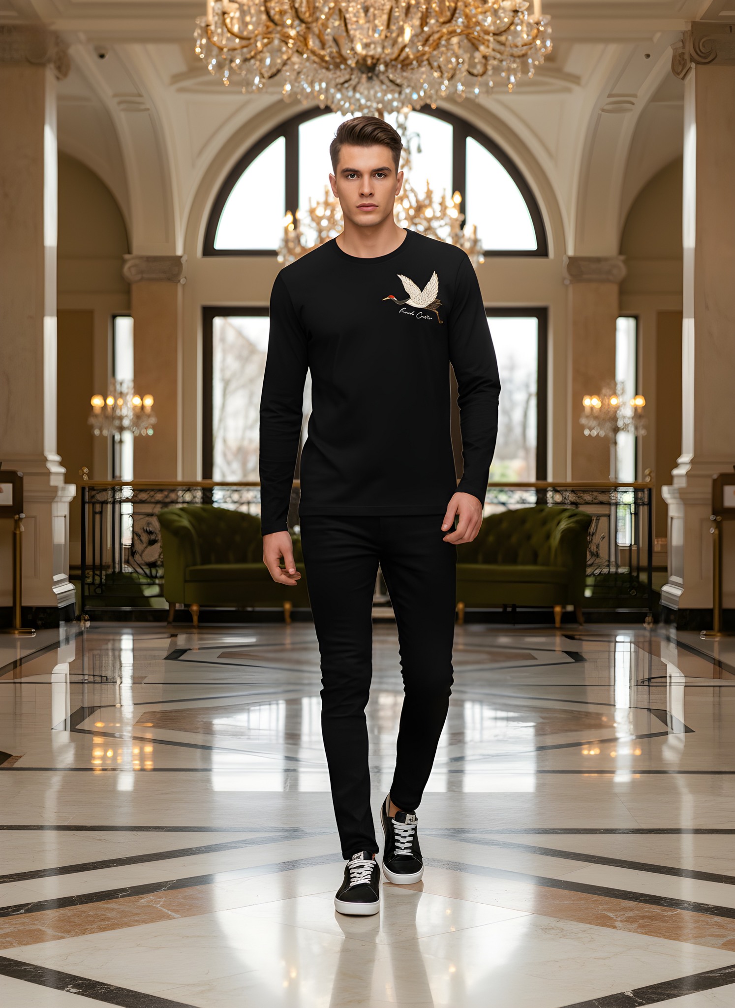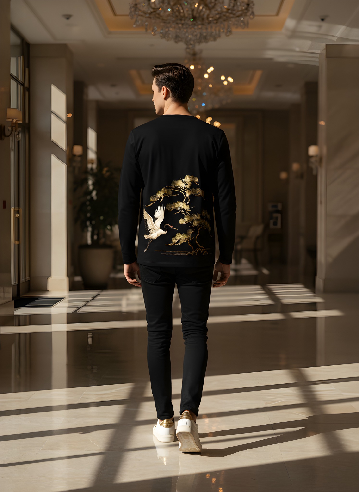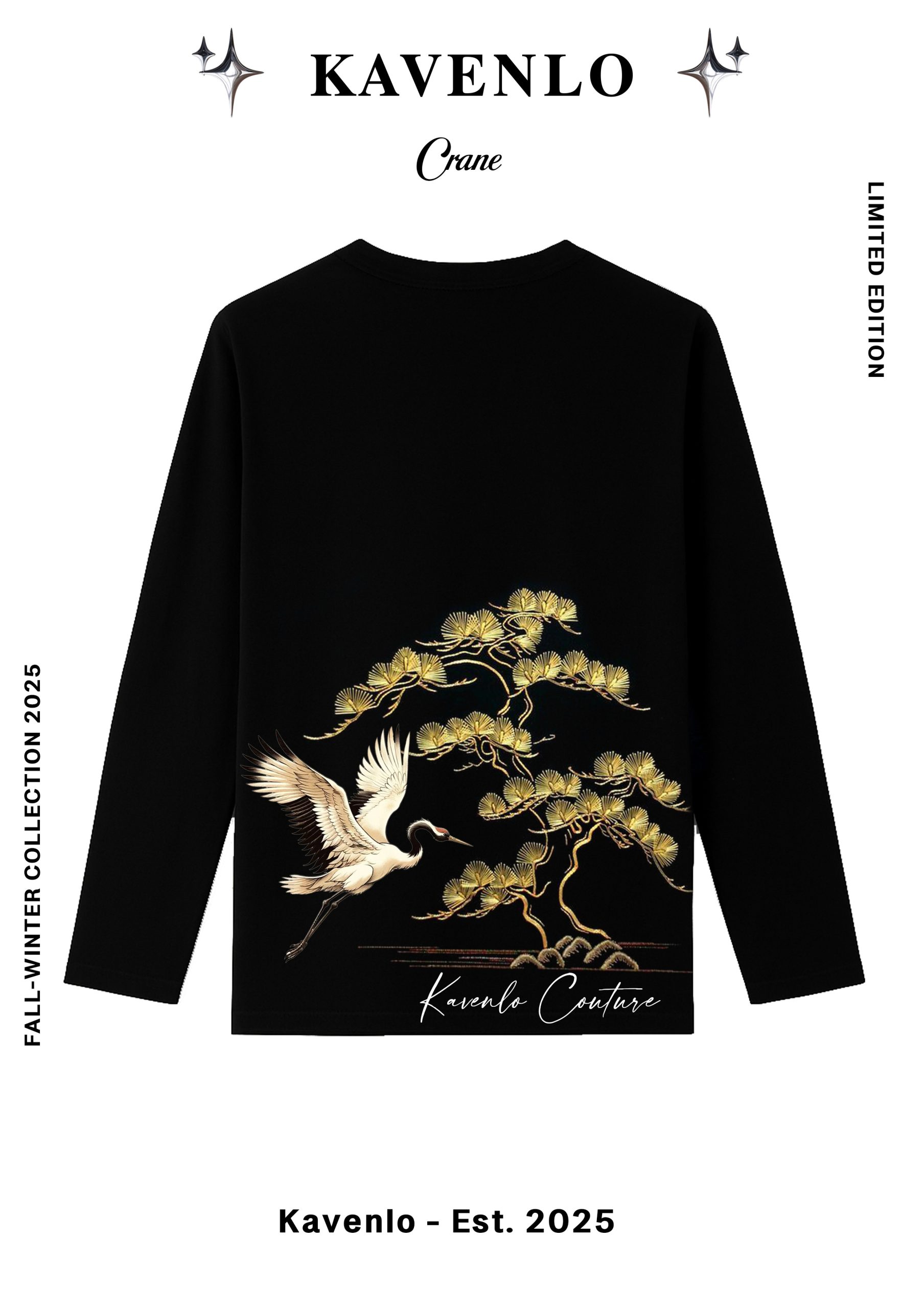 Lấy cảm hứng từ hình ảnh chim hạc và cây tùng – biểu tượng của trường thọ, may mắn và tinh thần thanh tao. Gam đen chủ đạo kết hợp chi tiết vàng ánh kim mang đến vẻ sang trọng, tinh tế, thể hiện rõ tinh thần KAVENLO Couture – đơn giản nhưng đẳng cấp.
