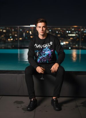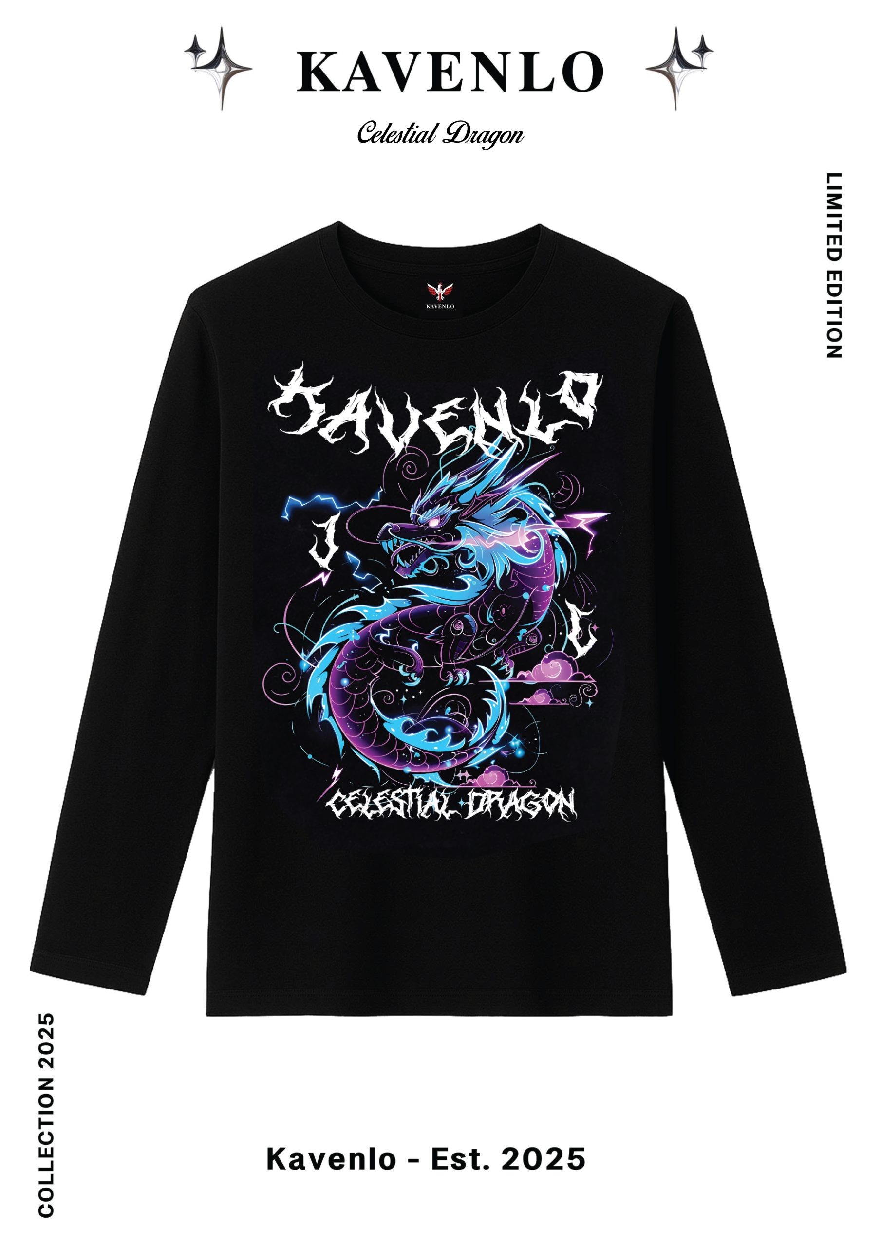 Celestial Dragon tái hiện hình tượng Thần Long bay giữa bầu trời, biểu tượng của năng lượng, quyền uy và sự tái sinh bất tận. Thiết kế được khắc họa bằng đường nét lượn sóng mạnh mẽ, ánh sáng điện lam và tím tượng trưng cho nguồn sức mạnh siêu nhiên ẩn trong mỗi con người hiện đại. Con rồng bay lên giữa mây gió gợi cảm hứng tự do – bứt phá – không giới hạn, như tuyên ngôn thời trang của thế hệ mới: sống bản lĩnh, dám bộc lộ năng lượng thật. Từng chi tiết được kết hợp giữa văn hóa phương Đông huyền thoại và phong cách streetwear hiện đại, tạo nên tổng thể vừa bí ẩn, vừa thời thượng. Triết lý “Less Noise – More Style” được thể hiện trọn vẹn qua sự cân bằng giữa cảm xúc mãnh liệt và tinh thần tối giản mang bản sắc KAVENLO.