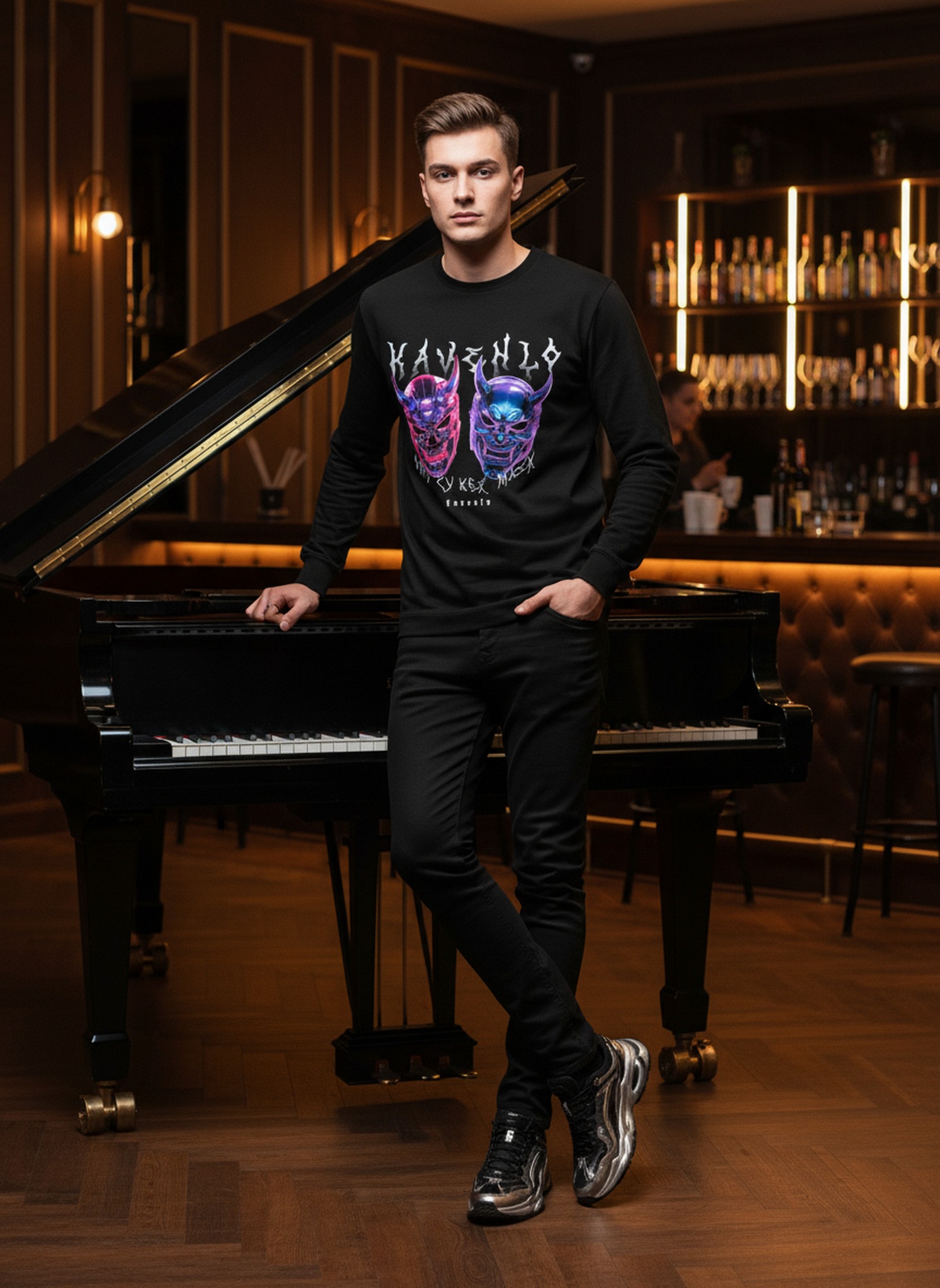 Cyber Oni Mask khai sinh từ sự giao thoa giữa văn hóa Nhật Bản cổ đại và thế giới cyberpunk tương lai. Hình tượng mặt nạ Oni, biểu trưng cho nỗi sợ, quyền lực và bản năng đen tối của con người, được tái hiện trong chất liệu ánh kim kỹ thuật số – rực rỡ như ánh đèn neon của Tokyo năm 2099. Hai chiếc mặt nạ mang sắc tím điện và đỏ plasma, đối nghịch mà hòa quyện, thể hiện cuộc chiến nội tâm giữa ánh sáng và bóng tối – giữa con người thật và lớp vỏ ảo trong thế giới công nghệ. Thiết kế gói gọn tinh thần dark-tech street couture của KAVENLO: sắc lạnh, hiện đại nhưng giàu chiều sâu văn hóa. Đây là tuyên ngôn cho thế hệ không ngại khác biệt, dám đeo “mặt nạ” của riêng mình để bảo vệ bản sắc. Triết lý “Less Noise – More Style” vang lên như lời nhắn gửi: im lặng vẫn có thể bùng nổ.