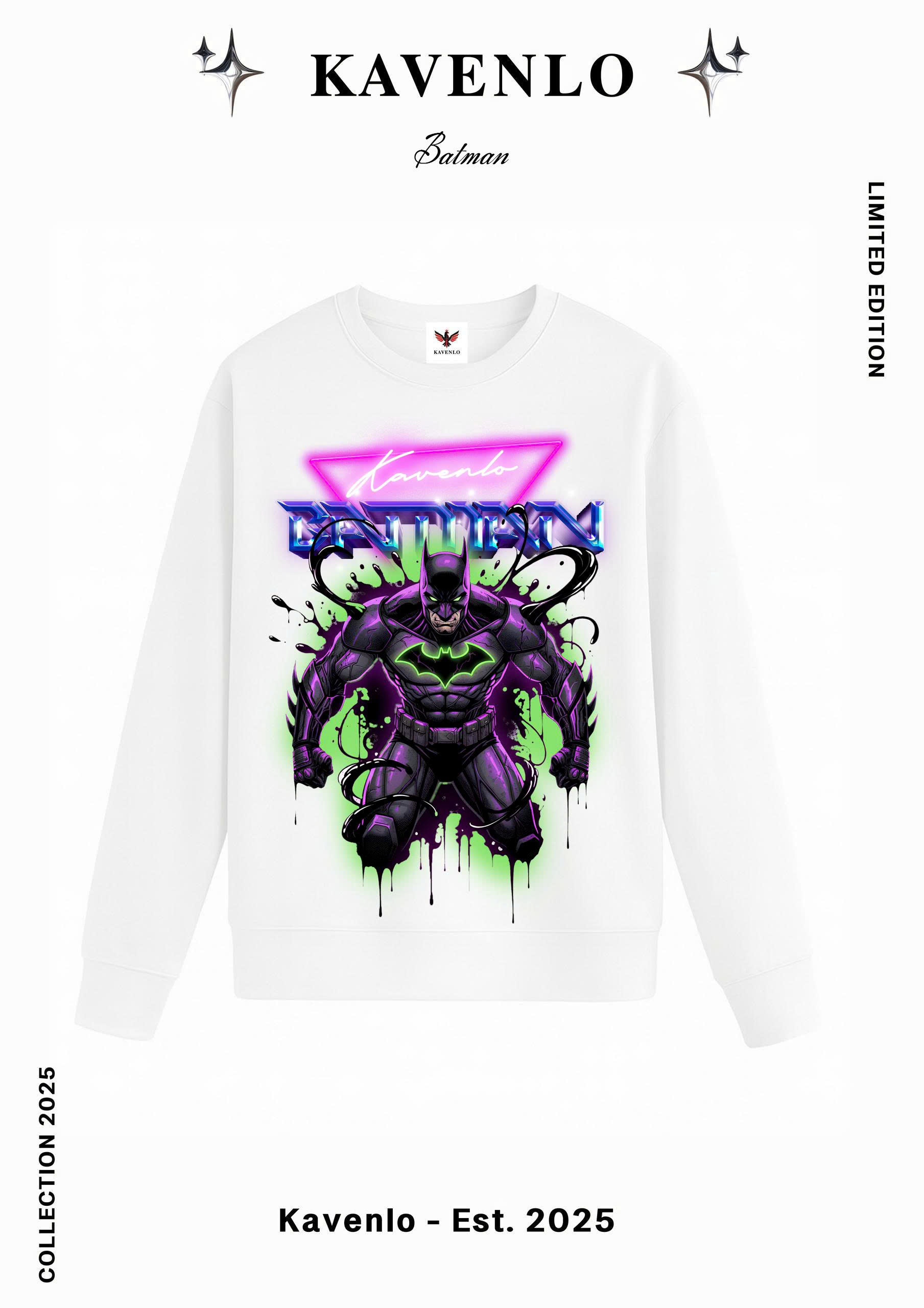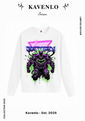 Lấy cảm hứng từ hiệp sĩ bóng đêm của Gotham, thiết kế BATMAN thể hiện sức mạnh, bản lĩnh và sự kiên định trong bóng tối – biểu tượng của sức mạnh nội tâm và phong cách bất khuất.Tông đen – tím neon – xanh lục phát quang tạo nên hiệu ứng cyberpunk hiện đại, mang tinh thần dark luxury streetwear đậm chất điện ảnh KAVENLO.