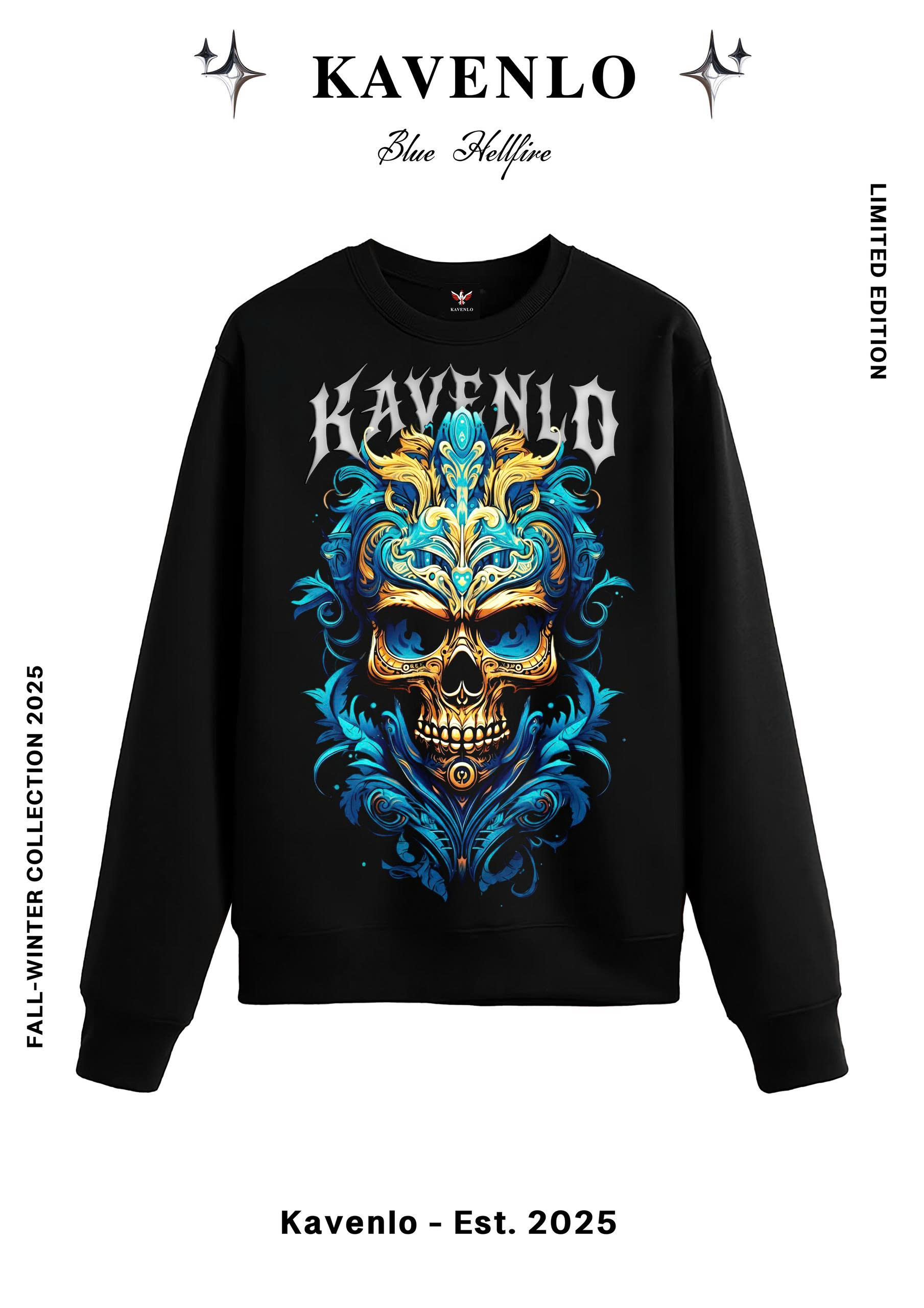 Tượng trưng cho ngọn lửa địa ngục xanh – sức mạnh của tái sinh và khát vọng bất diệt. Thiết kế đầu lâu hòa cùng họa tiết baroque ánh vàng và lam điện tạo nên vibe quyền lực, gothic và nghệ thuật cổ điển pha hiện đại. Gam đen – xanh dương – vàng ánh kim mang năng lượng bí ẩn và lôi cuốn đặc trưng của KAVENLO.