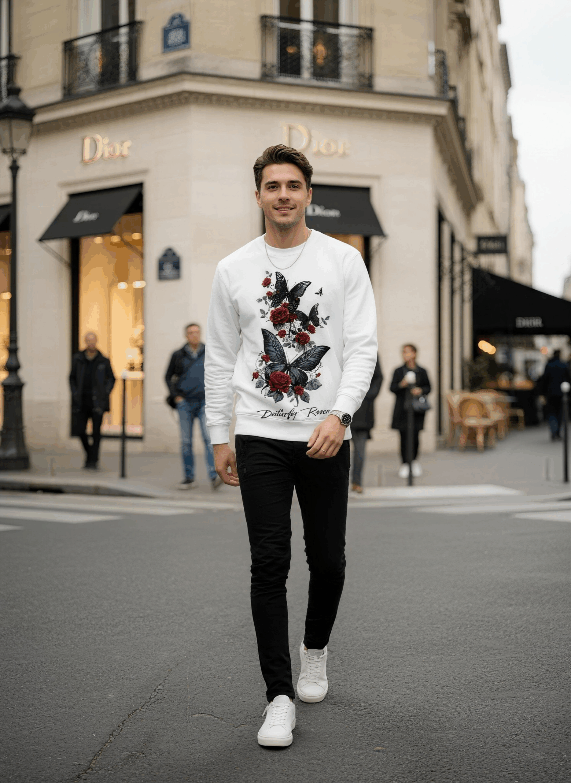 Butterfly là biểu tượng của sự tự do, tái sinh và vẻ đẹp thoát khỏi giới hạn. Thiết kế khắc họa đôi cánh bướm đen thanh lịch vươn mình giữa không gian rực sắc hoa, gợi cảm giác vừa mong manh vừa kiêu hãnh – như hành trình biến đổi của tâm hồn giữa bóng tối và ánh sáng. Sự kết hợp giữa gam đen huyền và trắng tinh khôi tạo nên điểm nhấn đối lập sang trọng, biểu trưng cho vẻ đẹp của sự chuyển hóa – khi yếu đuối trở thành sức mạnh. Thiết kế thể hiện triết lý “Less Noise – More Style” – khi phong thái thanh thoát nhất lại chính là sự im lặng của đôi cánh biết tự do bay lên.