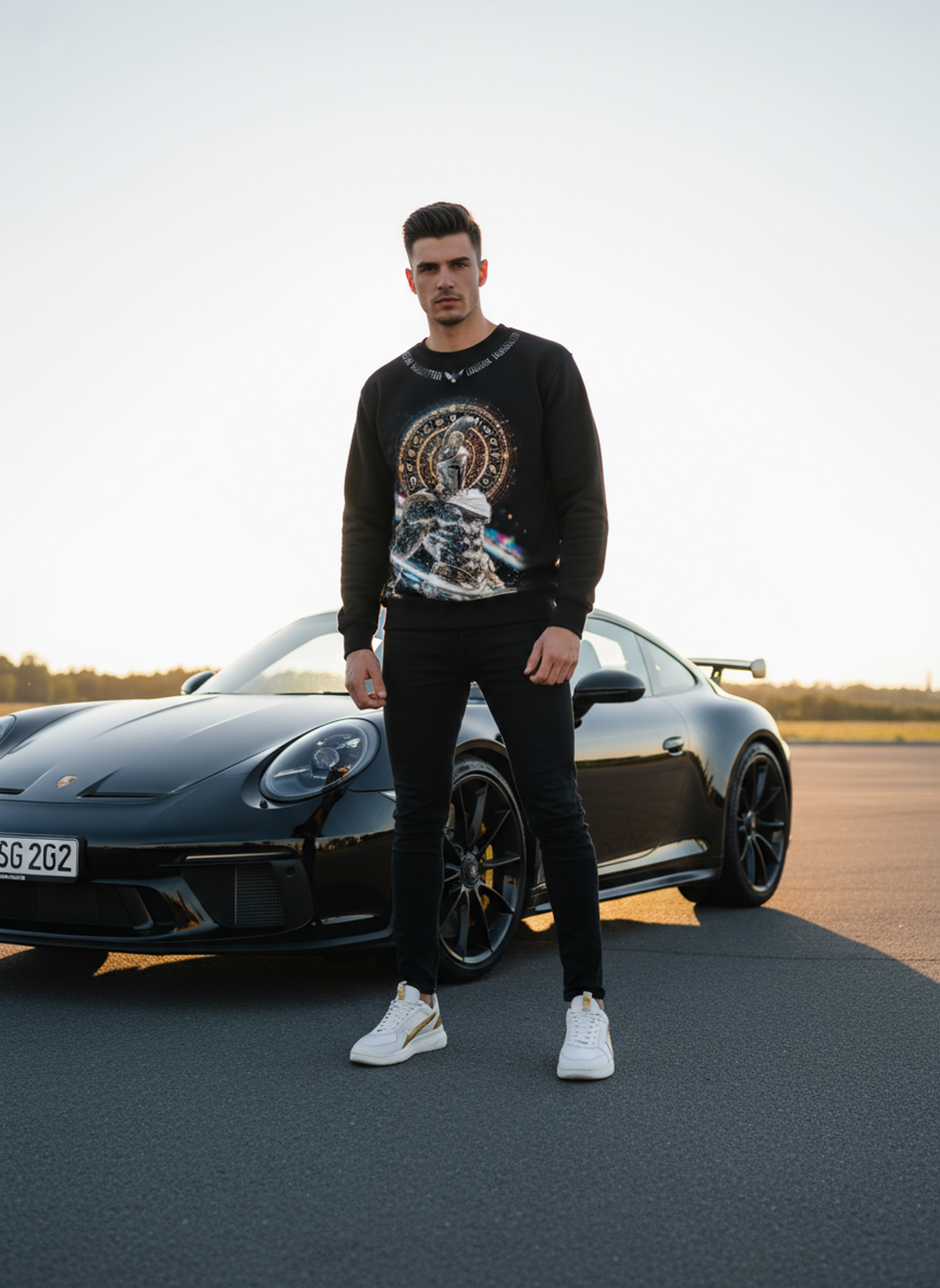 Greek Warrior được lấy cảm hứng từ chiến binh Hy Lạp cổ đại – biểu tượng của sức mạnh, danh dự và trí tuệ vượt thời gian. Hình ảnh chiến binh khoác giáp bạc, tỏa sáng giữa vòng xoáy biểu tượng thần thoại, khắc họa một vị anh hùng bước ra từ sử thi, mang năng lượng của các vị thần và ánh hào quang của chiến thắng. Ánh kim tuyến pha sắc vàng đồng tượng trưng cho tinh thần bất diệt và khát vọng chinh phục, được tái hiện qua bố cục thị giác hiện đại và mạnh mẽ. Thiết kế mang thông điệp “Less Noise – More Style” – khi bản lĩnh thật sự không cần lời hô vang, mà vang vọng qua từng bước đi của kẻ kiêu hãnh.