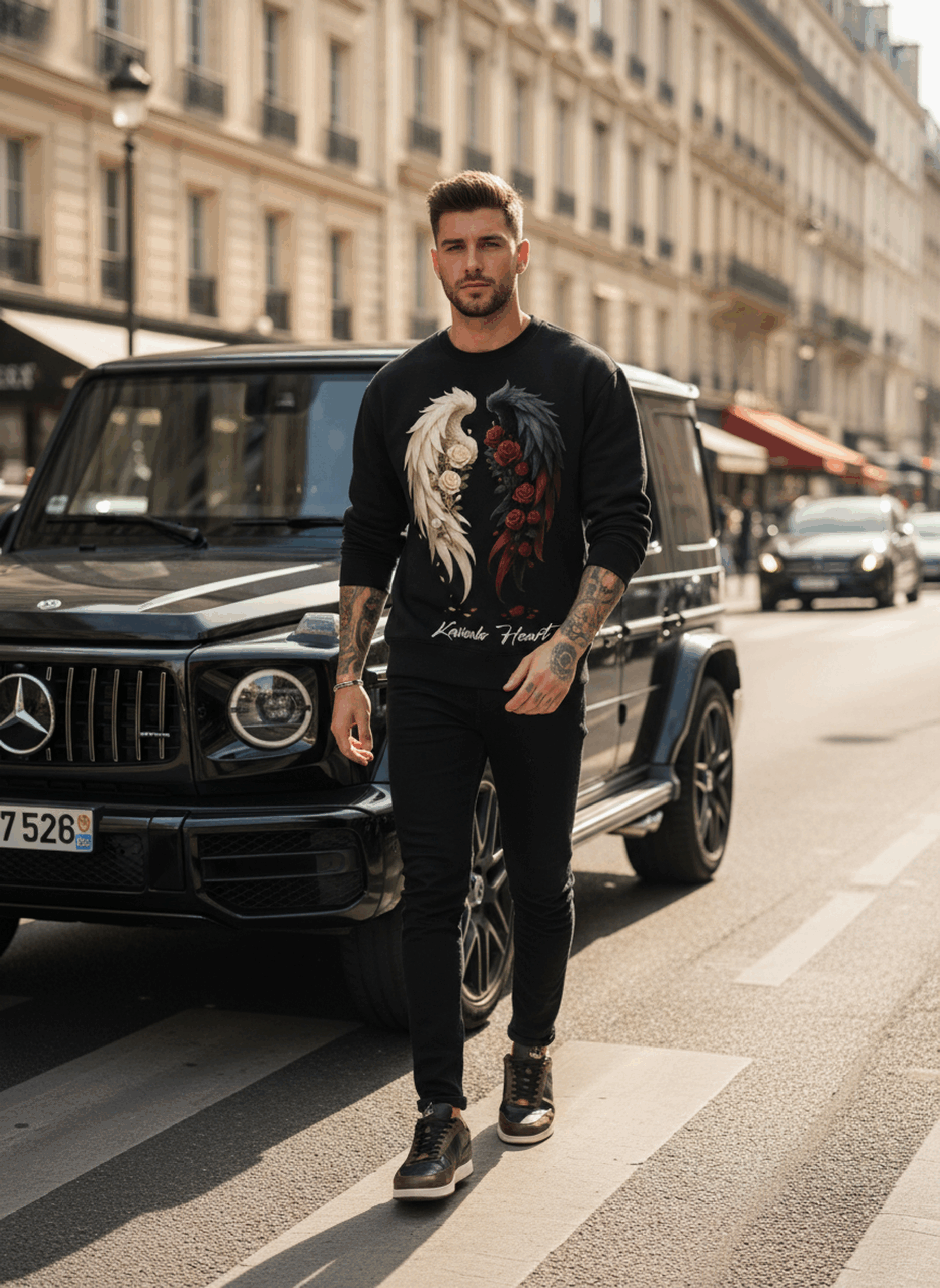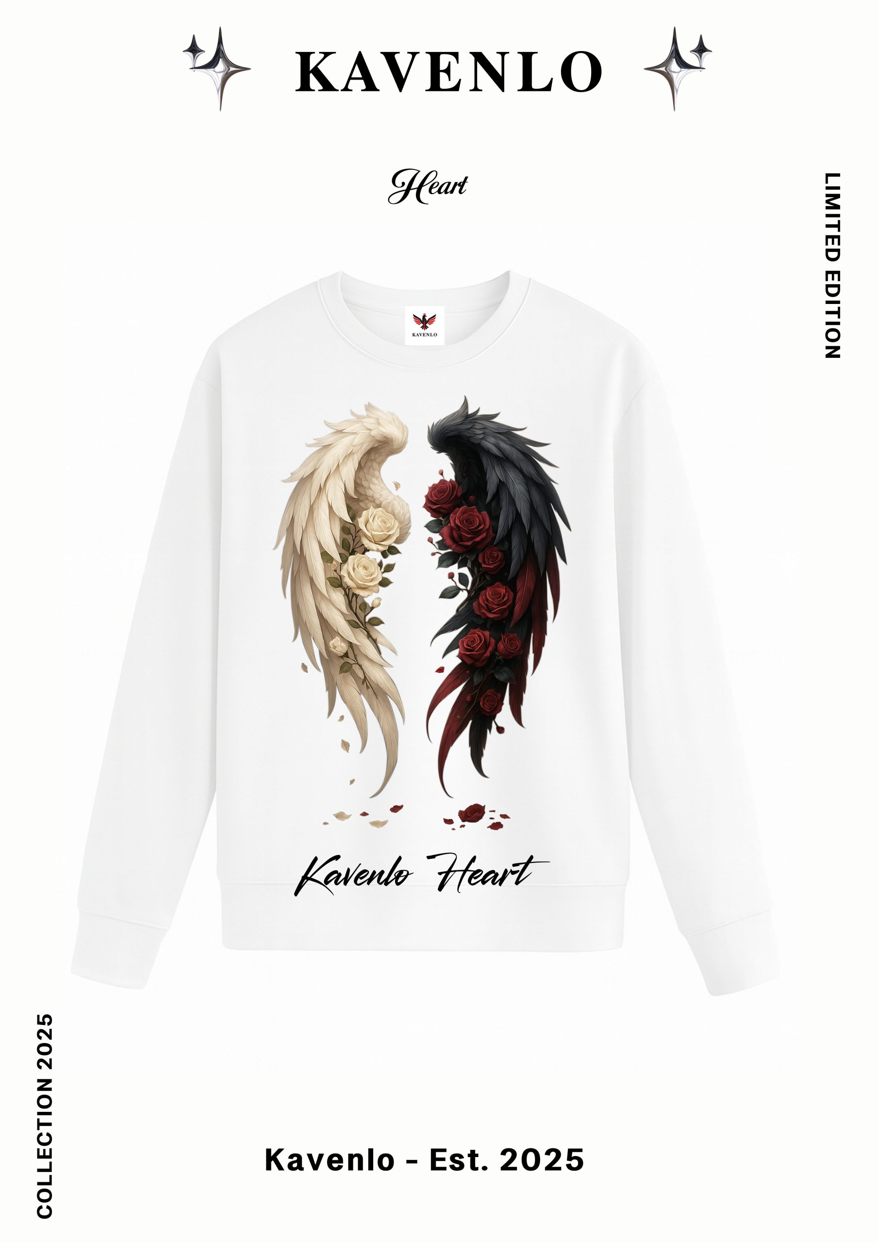 Heart là biểu tượng của hai nửa linh hồn – ánh sáng và bóng tối, thuần khiết và đam mê. Đôi cánh trắng và đen hòa quyện quanh những đóa hồng tượng trưng cho sự đối lập trong cảm xúc con người: dịu dàng và mãnh liệt, tổn thương và hồi sinh. Bố cục đối xứng cùng gam màu trầm sang tạo nên cảm giác vừa lãng mạn, vừa siêu thực, gợi nên vẻ đẹp của những tâm hồn biết yêu, biết đấu tranh, và biết giữ lại phần nhân bản giữa hỗn độn. Thiết kế truyền tải tinh thần “Less Noise – More Style” – khi cảm xúc sâu sắc nhất không cần ngôn từ, mà toát ra qua sự tĩnh lặng của trái tim.