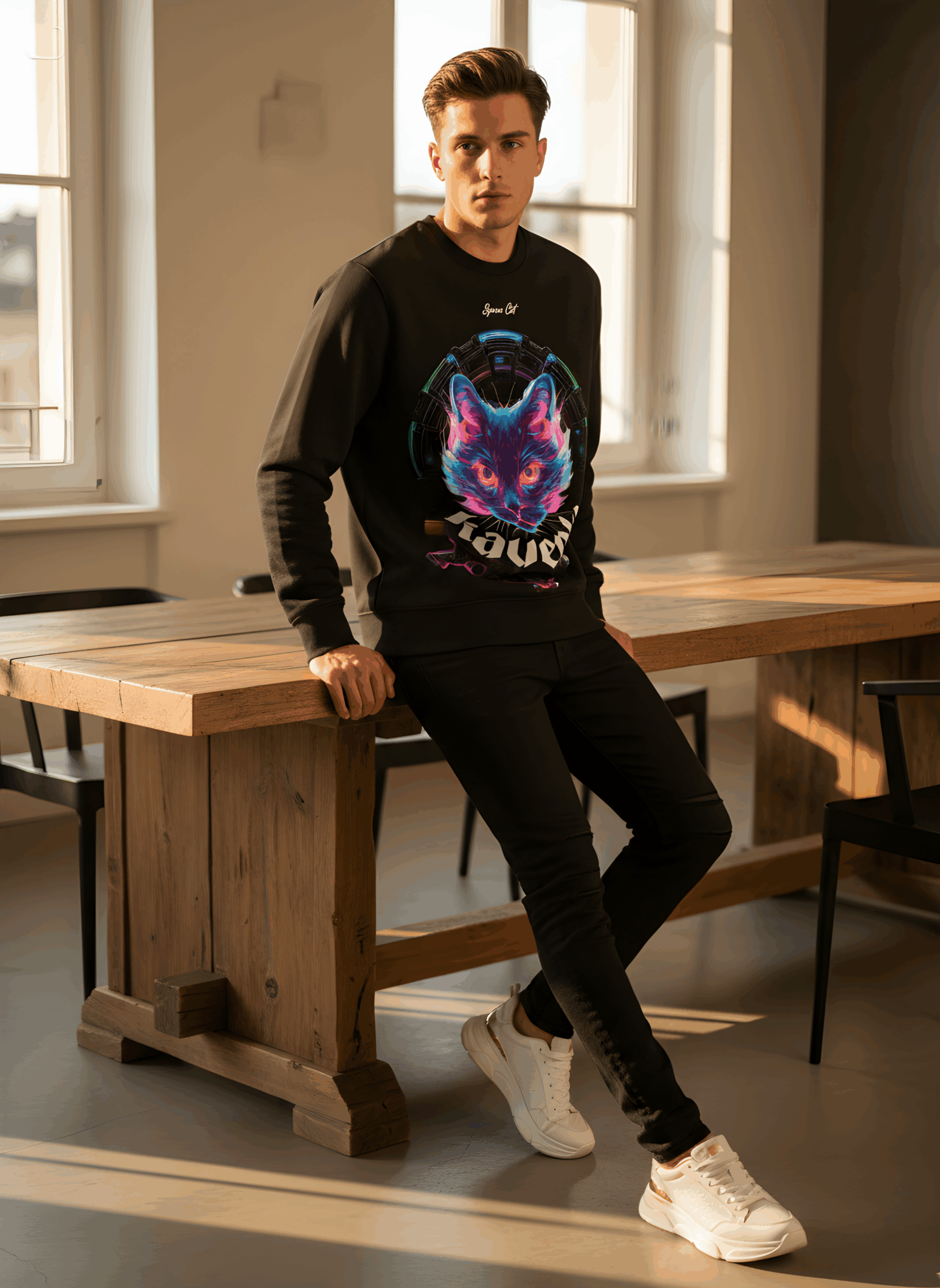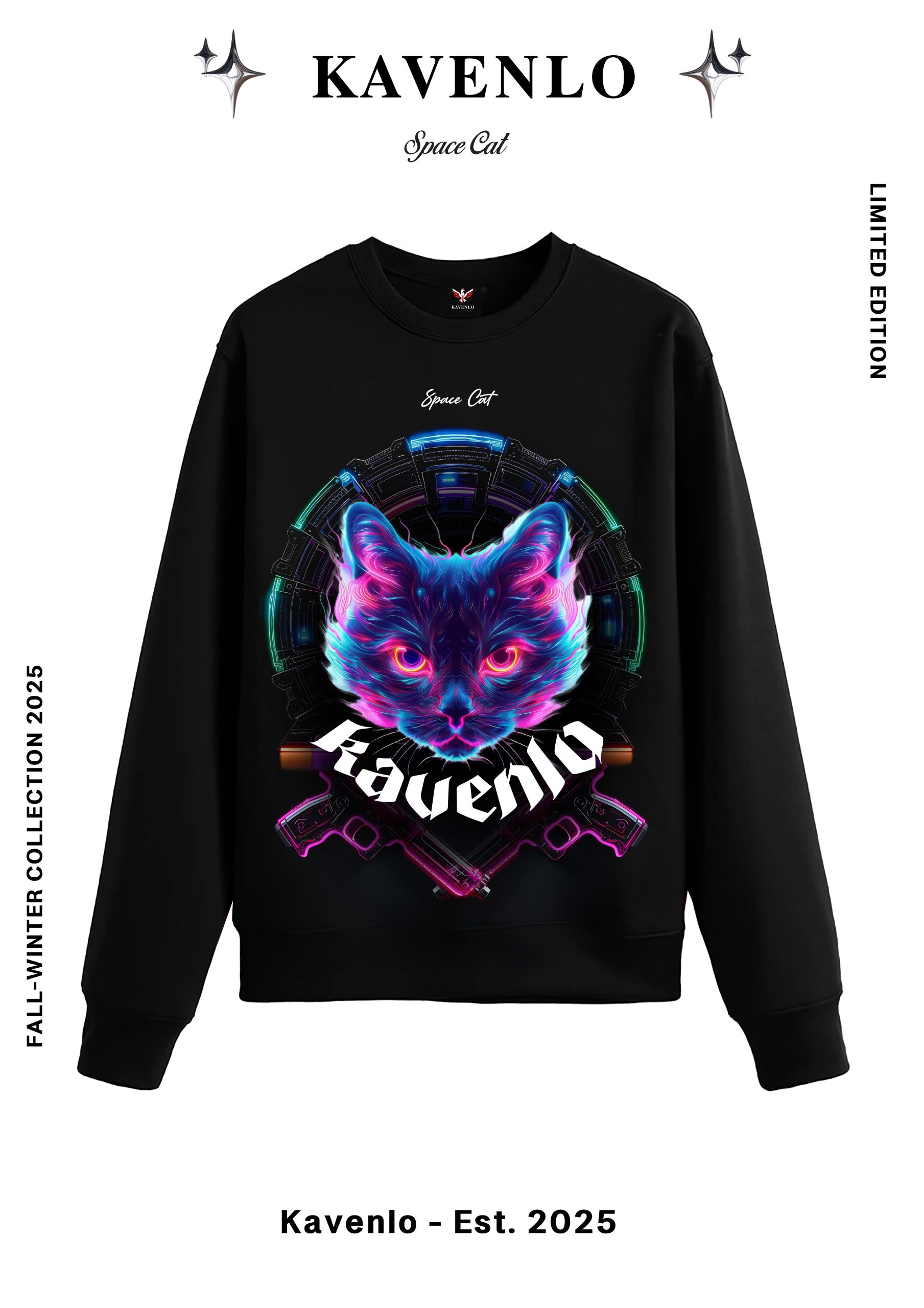 Space Cat là biểu tượng của sự tự do và tò mò bất tận, một linh hồn du hành giữa các vì sao – đại diện cho thế hệ không ngừng khám phá giới hạn của bản thân. Lấy cảm hứng từ văn hóa Cyberpunk và aesthetic Neon Tokyo, thiết kế sử dụng tông tím điện – xanh plasma – hồng fuchsia, mô phỏng ánh sáng của các hành tinh trong không gian sâu thẳm. Đôi mắt mèo phát sáng rực rỡ như AI awakened, phản chiếu bản ngã của con người trong thời đại kỹ thuật số – vừa hoang dã, vừa thông minh, vừa khó đoán. Bên dưới là hai khẩu súng plasma giao chéo, tượng trưng cho tinh thần chiến đấu, bảo vệ cá tính và tự do sáng tạo. Chiếc áo như một tuyên ngôn thời trang của tương lai, nơi Streetwear gặp Science Fiction – tạo nên bản hòa ca giữa điện năng, công nghệ và bản năng nguyên thủy. “Less Noise – More Style” – trong thế giới ồn ào, kẻ im lặng chính là người gây chấn động.